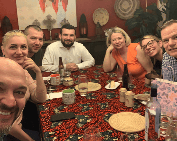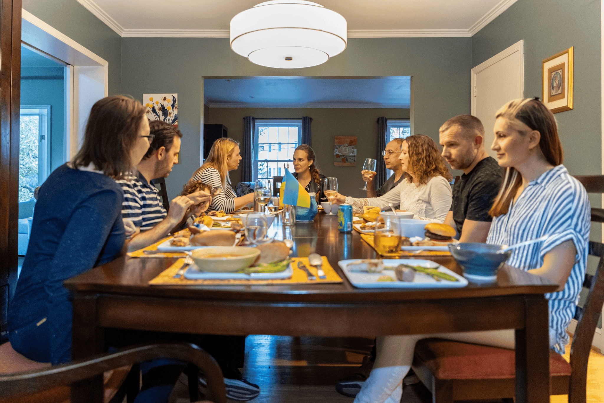 Prithvi and his wife Jennifer host the full sponsor group, as well as Tetiana and Serhii around the dining table for a meal together.